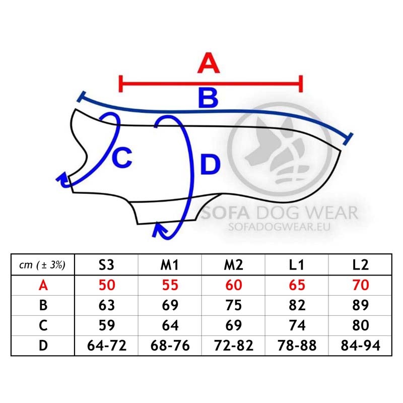 Die Bilder in der der Galerie zeigen, wie das Produkt am Hund sitzen soll, wobei der Sitz von vielen Faktoren abhängt, die zu den richtigen Körpermaßen dazu kommen: z. B. Brustbreite, Bemuskelung, Behaarung, Rutenhaltung, Alter, Geschlecht, Material des Modells etc. Es ist möglich, dass Sie einen kleinen Kompromiss eingehen müssen oder ein anderes Modell für Ihren Hund passender ist. Beachten Sie, dass bei den Modellen nicht jedes in der gleichen Größe passt, da wir Schnitte für viele verschiedene Hundefiguren anbieten. Somit ist z. B. nicht jede S2 eines Modells für einen Hund passend, der bereits eine S2 trägt.